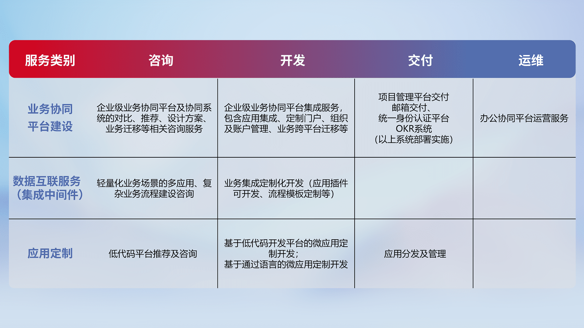 针对钉钉、、企微、、、IDaas等平台级产品提供产品的规划、、方案、、、、交付、、定制化开发等服务,,,,实现如统一协同办公、、智能客户服务、、、、混合会议管理、、、、智能数据查询、、、、等业务场景,,,,实现数字化转型。。。。